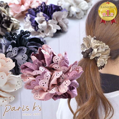 全品対象クーポン配布中! シュシュ リバーシブル レース ボリューム ヘアゴム ヘアーゴム 髪留め 髪止め 髪どめ サテン ヘアアクセサリー 可愛い シンプル 大人 誕生日 クリスマス 黒 ブラック ピンク グレー 白 上品 結婚式 披露宴 お呼ばれ パーティー プレゼント ギフト
